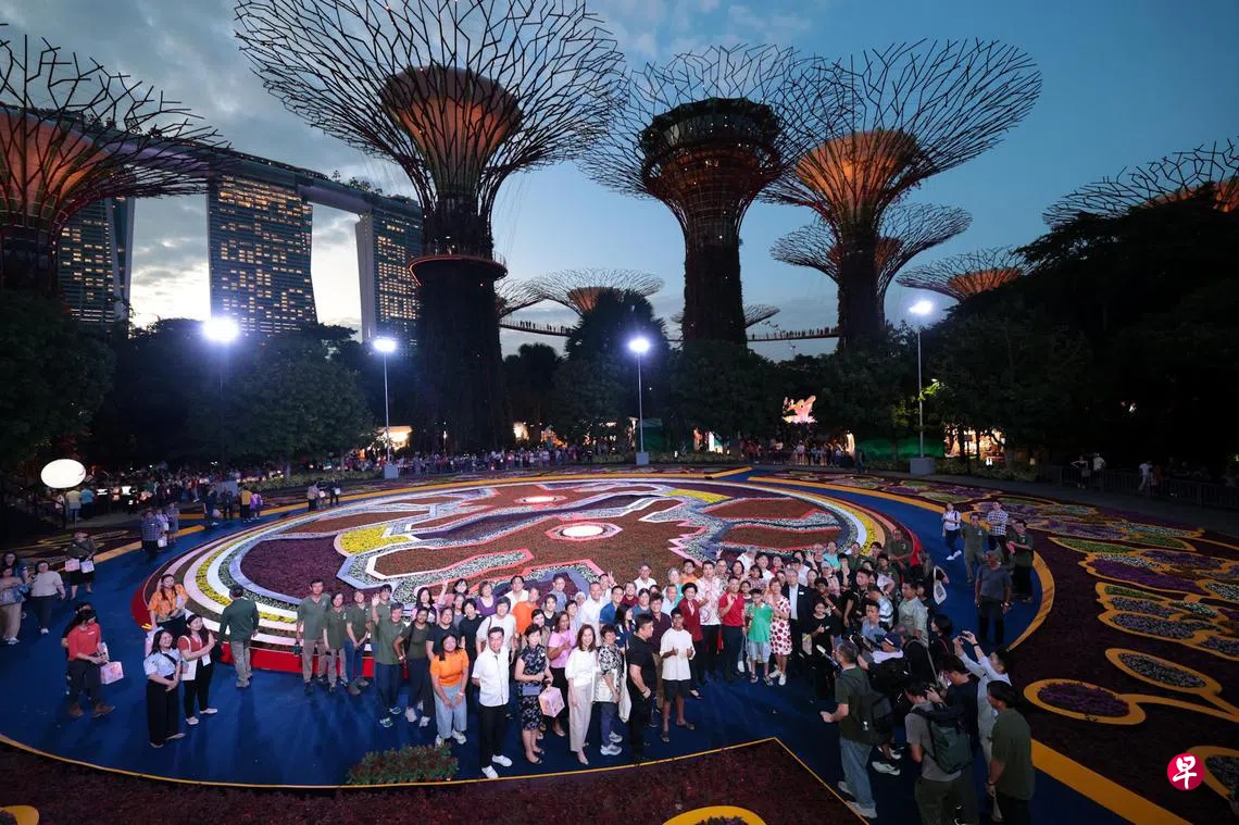 滨海湾花园的花园营运署长郑文胜告诉《联合早报》,花毯由超过20名园艺师和250名社区义工一同打造,耗时10天,园艺师还把本地标志性的龙头游乐场元素融入设计中,这是许多国人珍贵的童年记忆。
