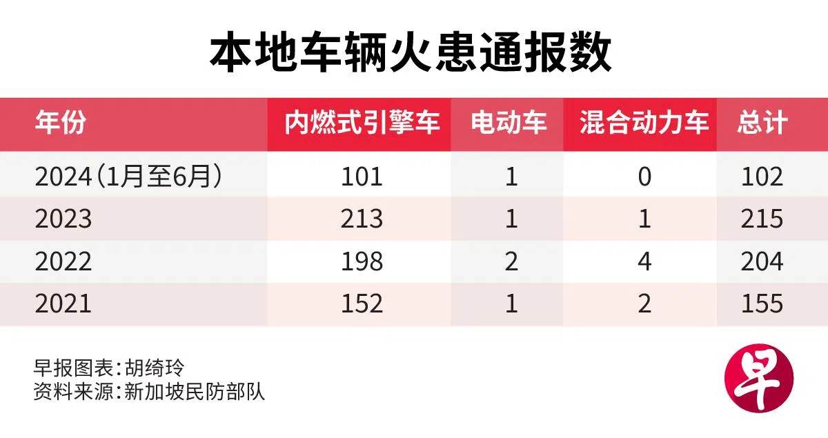 民防部队发言人提供给《联合早报》的数据显示,今年上半年共发生了102起汽车火患,其中涉及电动车的火患仅有一起,其余都是内燃式引擎车失火。