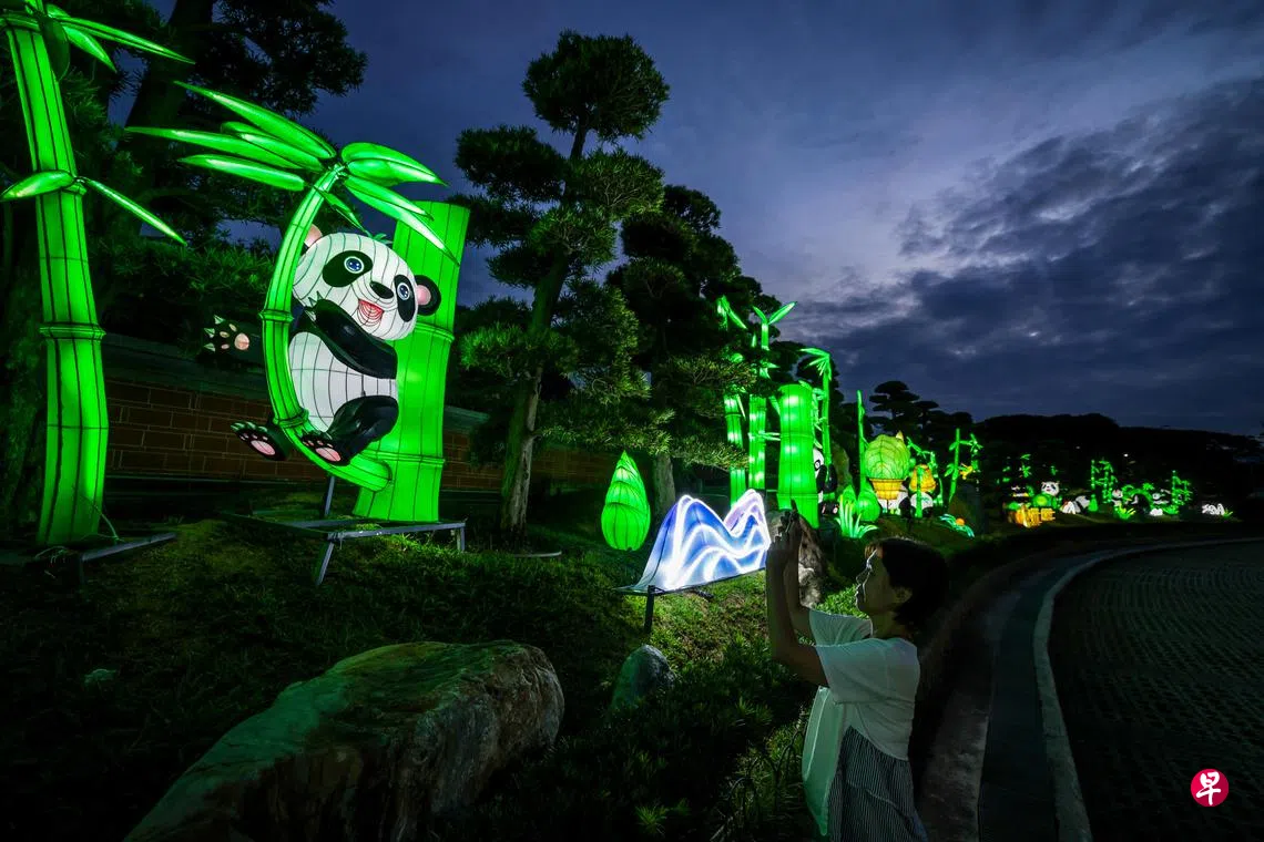 已列为国家古迹的莲山双林寺星期二(9月10日)傍晚中秋彩灯亮起,熊猫、莲花、鲤鱼等多种造型的灯饰绚丽夺目。这组灯饰结合多种动植物造型,是为了表达和谐共存的主题。
