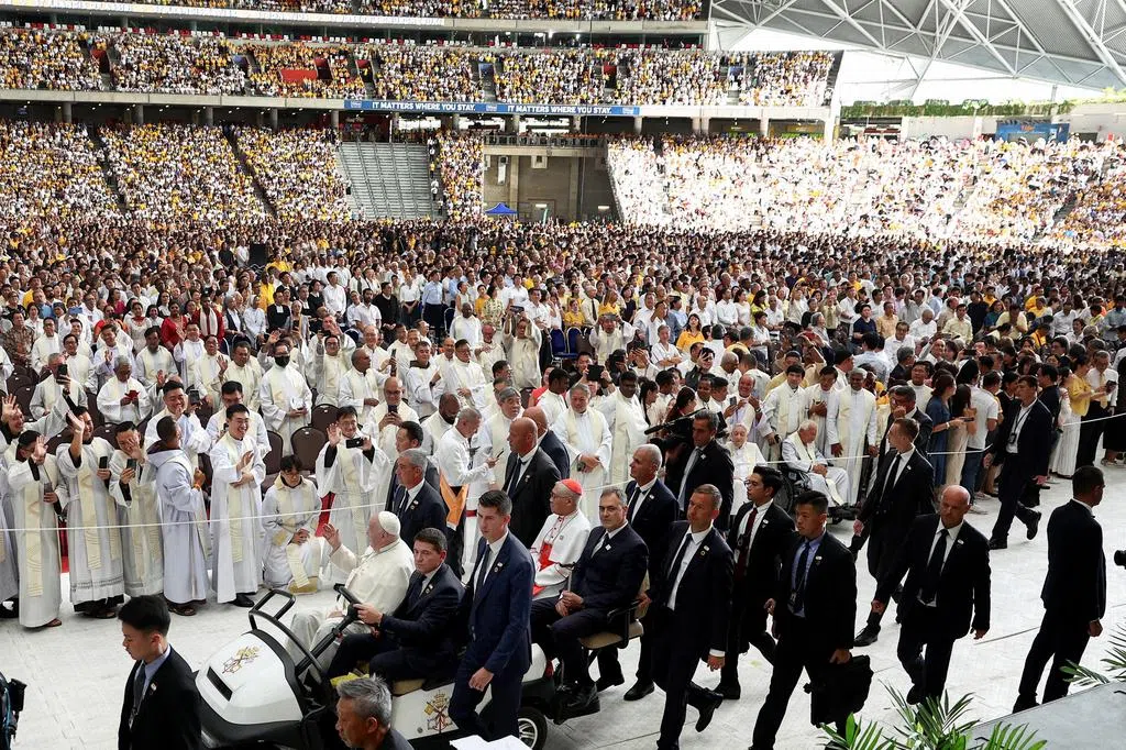 乘坐本地制造的现代Ioniq 5纯电动车,方济各一出现就引起人群欢呼尖叫,众人纷纷举起手机拍摄。看到守候已久的信徒与民众,方济各降下车窗,向他们挥手致意。在榜鹅,甚至有信徒在专车停下片刻时,把握机会上前与教宗互动。
