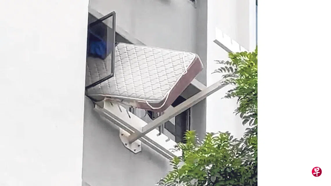另一段视频则显示,单位住户打开窗口后,竟然将一个单人床褥从单位内丢下,之后再把窗户关上。现场当时吸引不少居民驻足围观。
