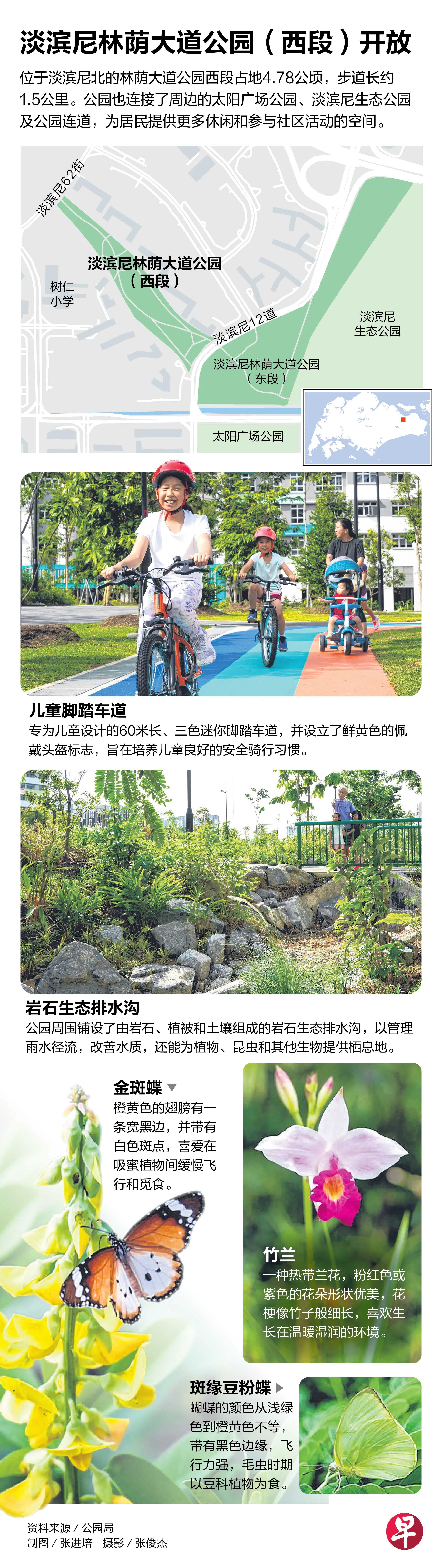 淡滨尼林荫大道公园西段正式开放,让淡滨尼北的居民不但有了运动休闲的自然空间,也提升了这个新社区和周遭的连接性。新公园绿意盎然,花草种类繁多,还有儿童安全脚踏车道、攀岩墙和沙池、户外健身角落等设施。