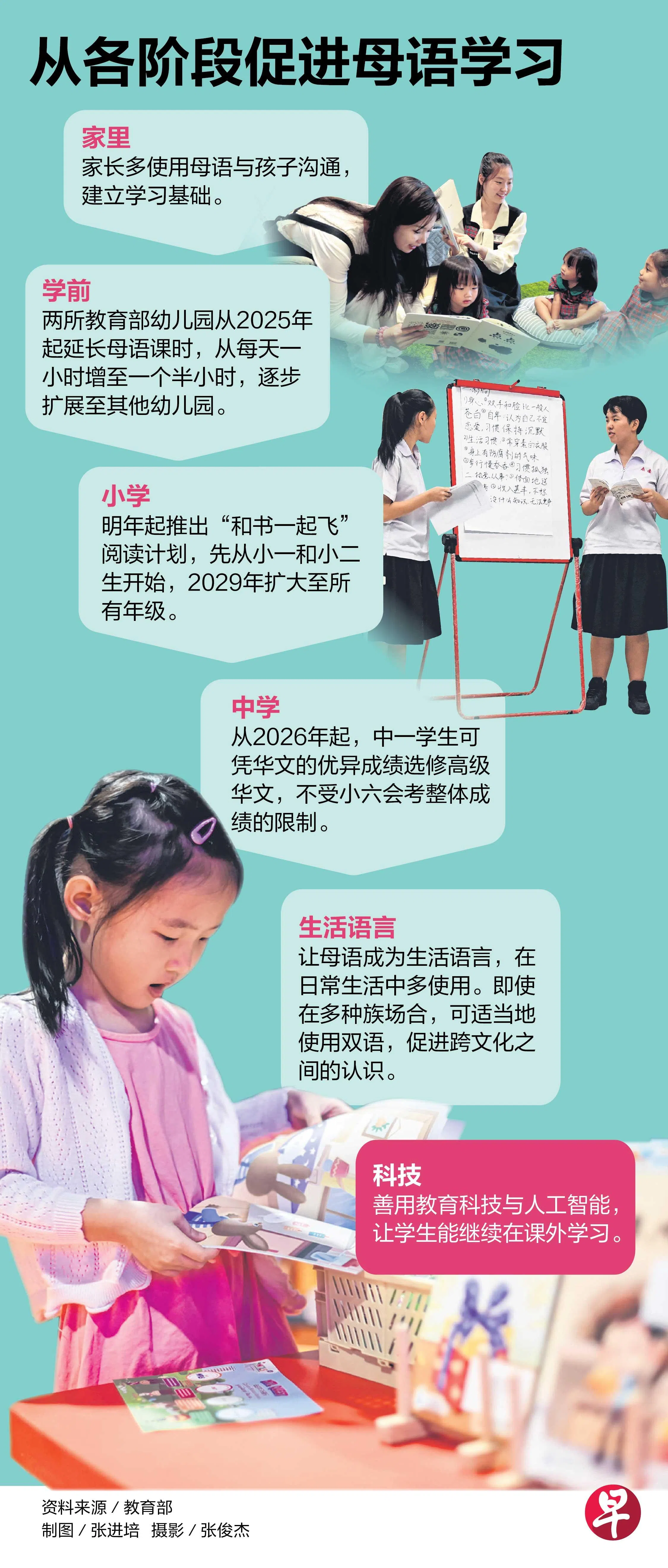 教育部将在学前阶段和小学,为学生提供更多使用母语的机会,并培养他们的阅读兴趣。中学也将支持语文能力强的学生修读高级母语。