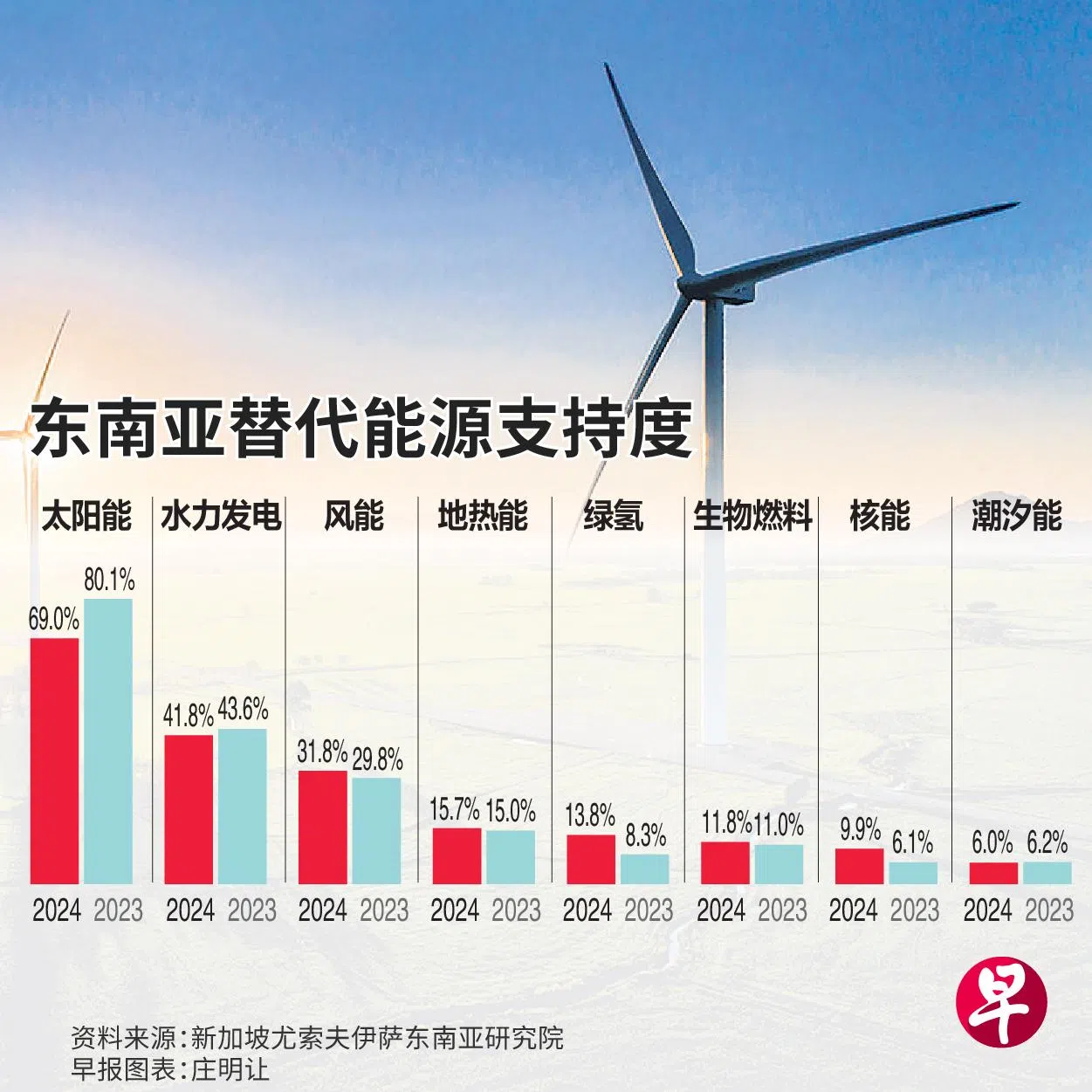 调查团队自2022年起,让受访者选择两个他们认为最具潜能的清洁能源。整体而言,选择核能的东南亚人从去年的6.1%增至今年9.9%。