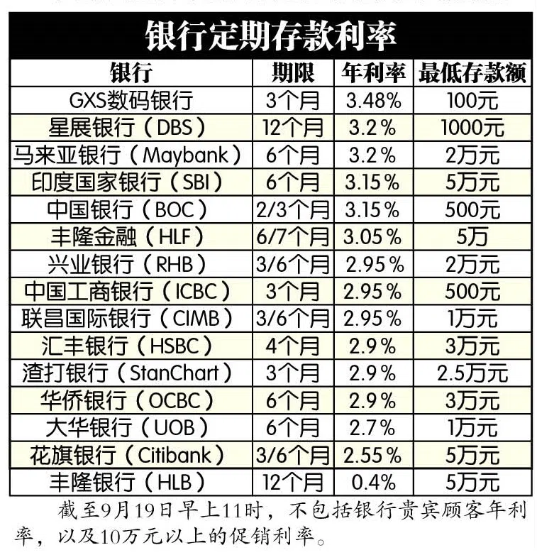 美国联邦储备局星期三(9月18日)宣布利率下调50个基点,是2020年3月以来首次降息。本地有至少六家银行过去两周陆续调低定存优惠利率,而目前开出最高定存利率的是GXS数码银行,利率为3.48%。