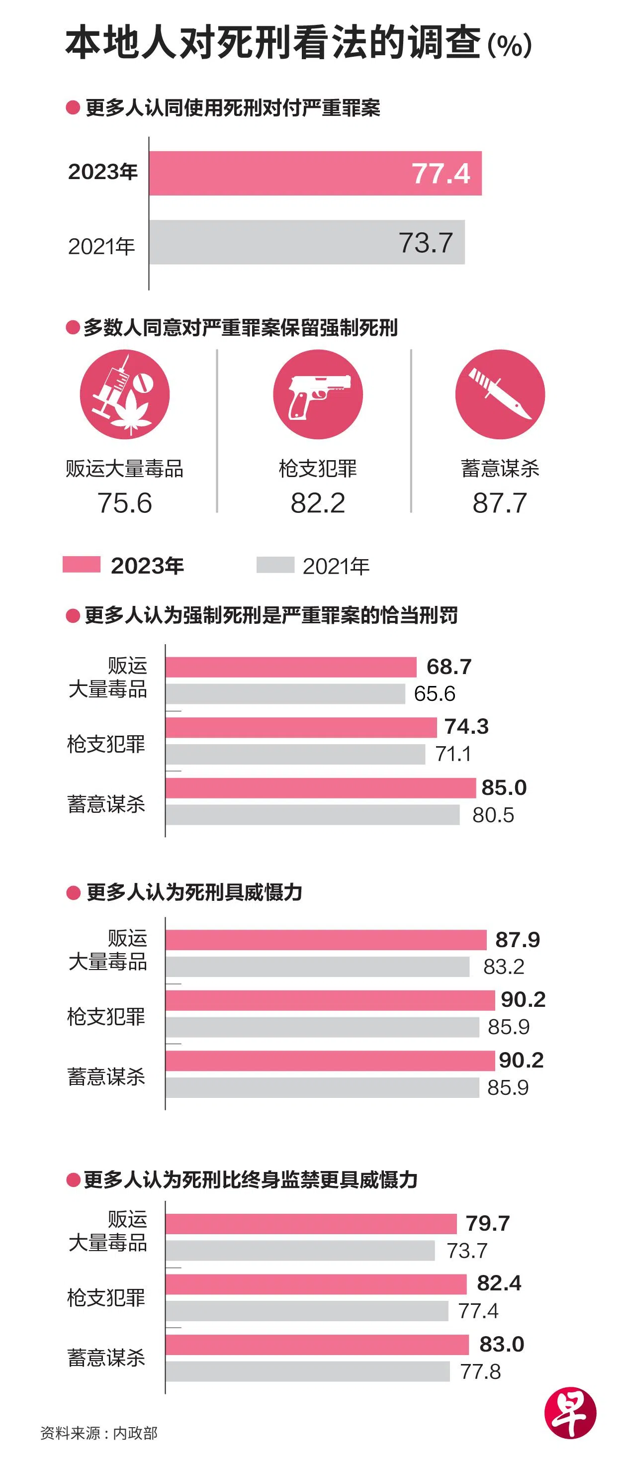 内政部时隔两年再次就公众对死刑的看法展开调查,对比2021年和2023年的调查结果,更多人认同使用死刑对付包括谋杀和贩毒等严重罪案,并且认为死刑比判处终身监禁更具威慑力。