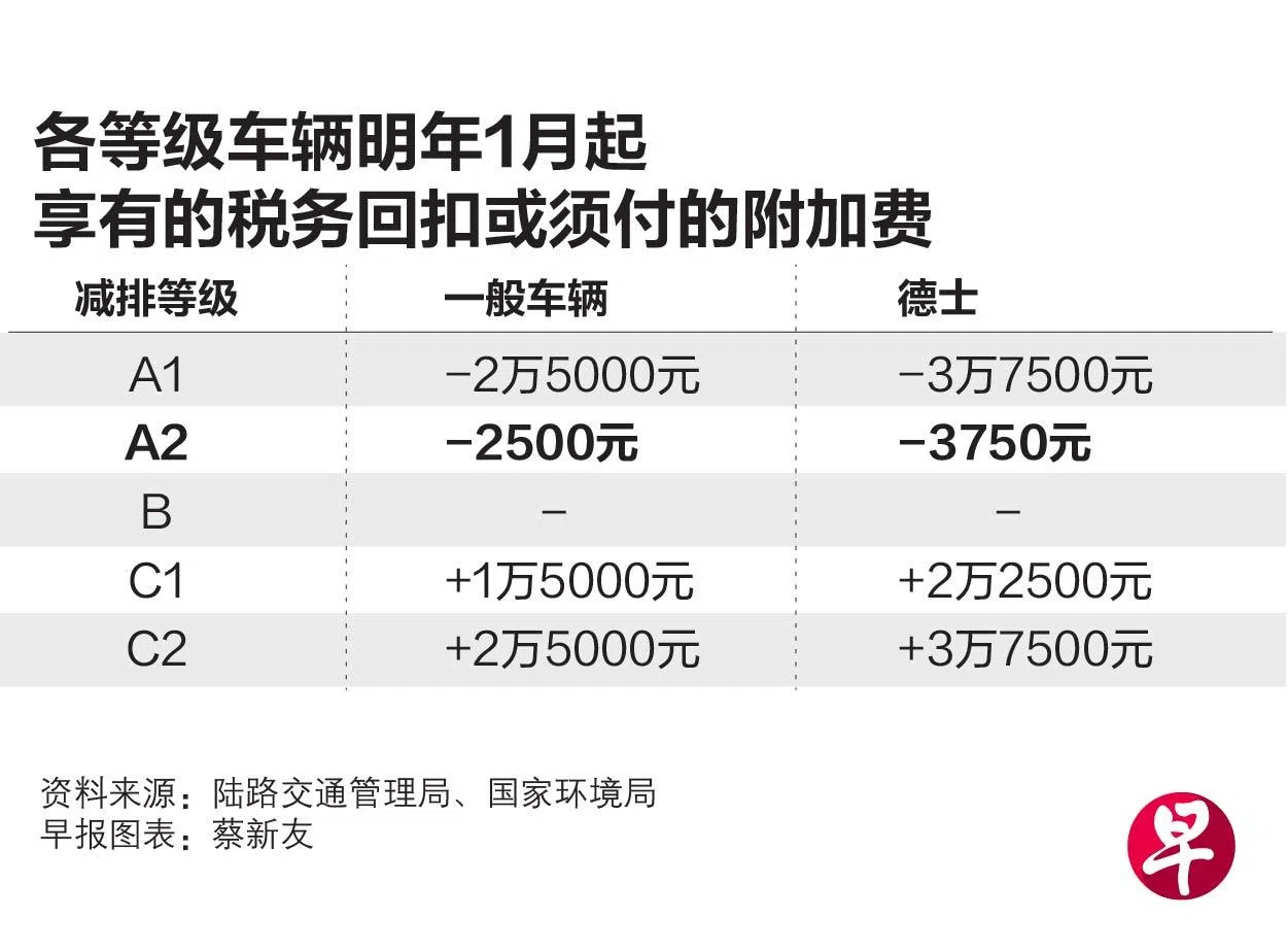 不过,A2级车辆的税务回扣则会从2025年1月1日起,调低至2500元。这主要适用于混合动力车。
