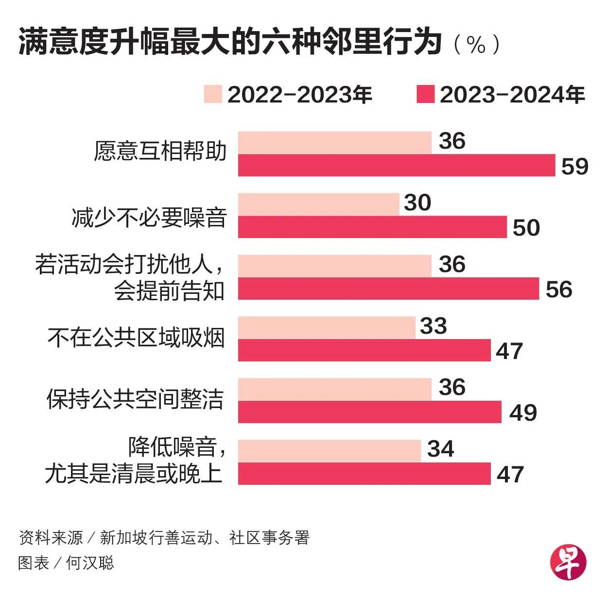调查显示,81%的本地居民对与邻居的关系感到满意,较上一年的69%来得高。满意度升幅最大的邻里行为中,前三项分别是:邻居愿意在日常生活中互相帮助、邻居在进行可能打扰到他人的活动前会提前告知,以及邻居会主动减少不必要噪音,例如使用门挡防止门猛烈关上等。