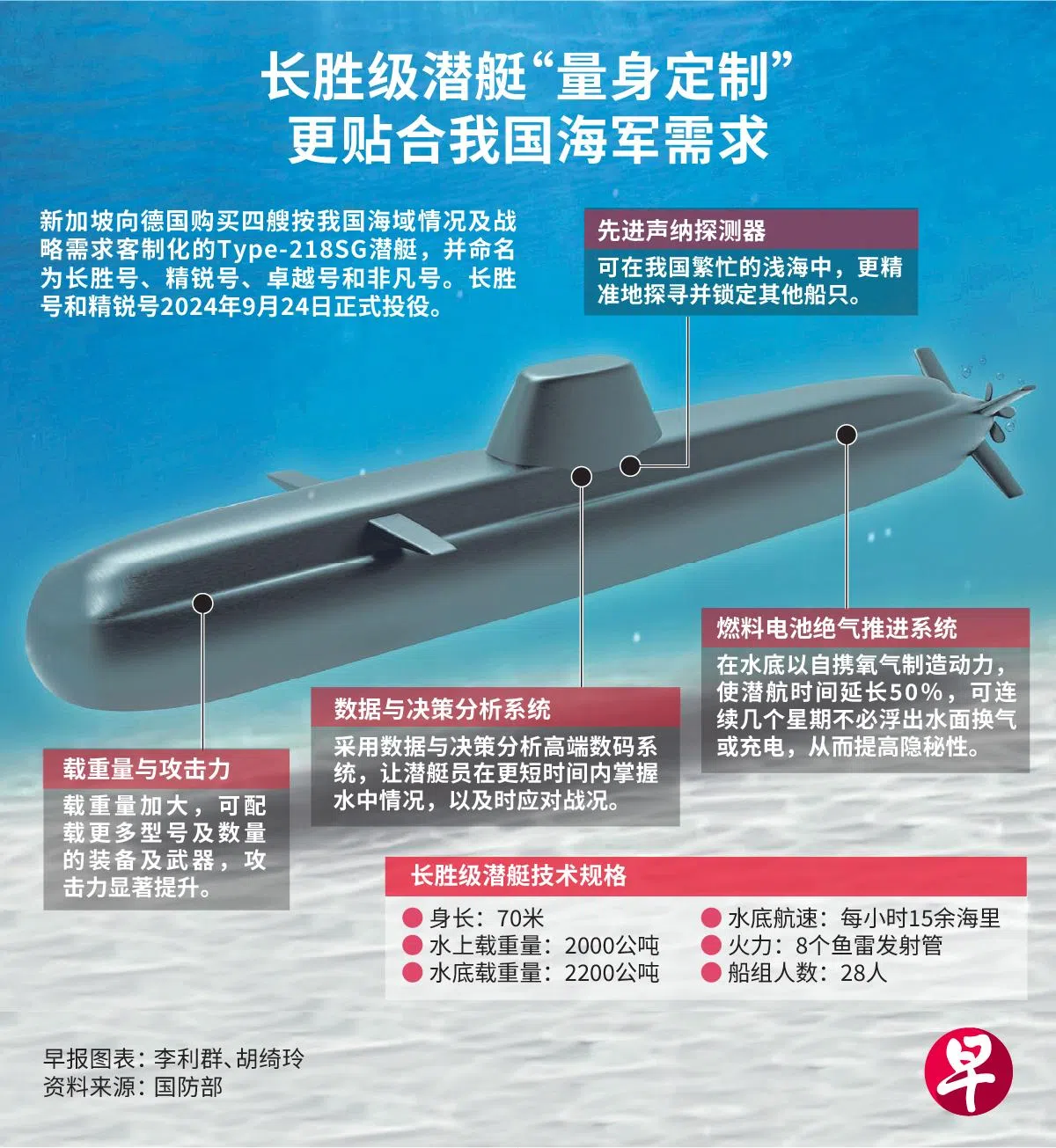 根据我国海军运作要求而在德国量身定造的首两艘“长胜级”潜艇——长胜号(RSS Invincible)和精锐号(RSS Impeccable),星期二(9月24日)下午在樟宜海军基地正式投役。今年也是我国建立潜艇舰队的第25个年头。