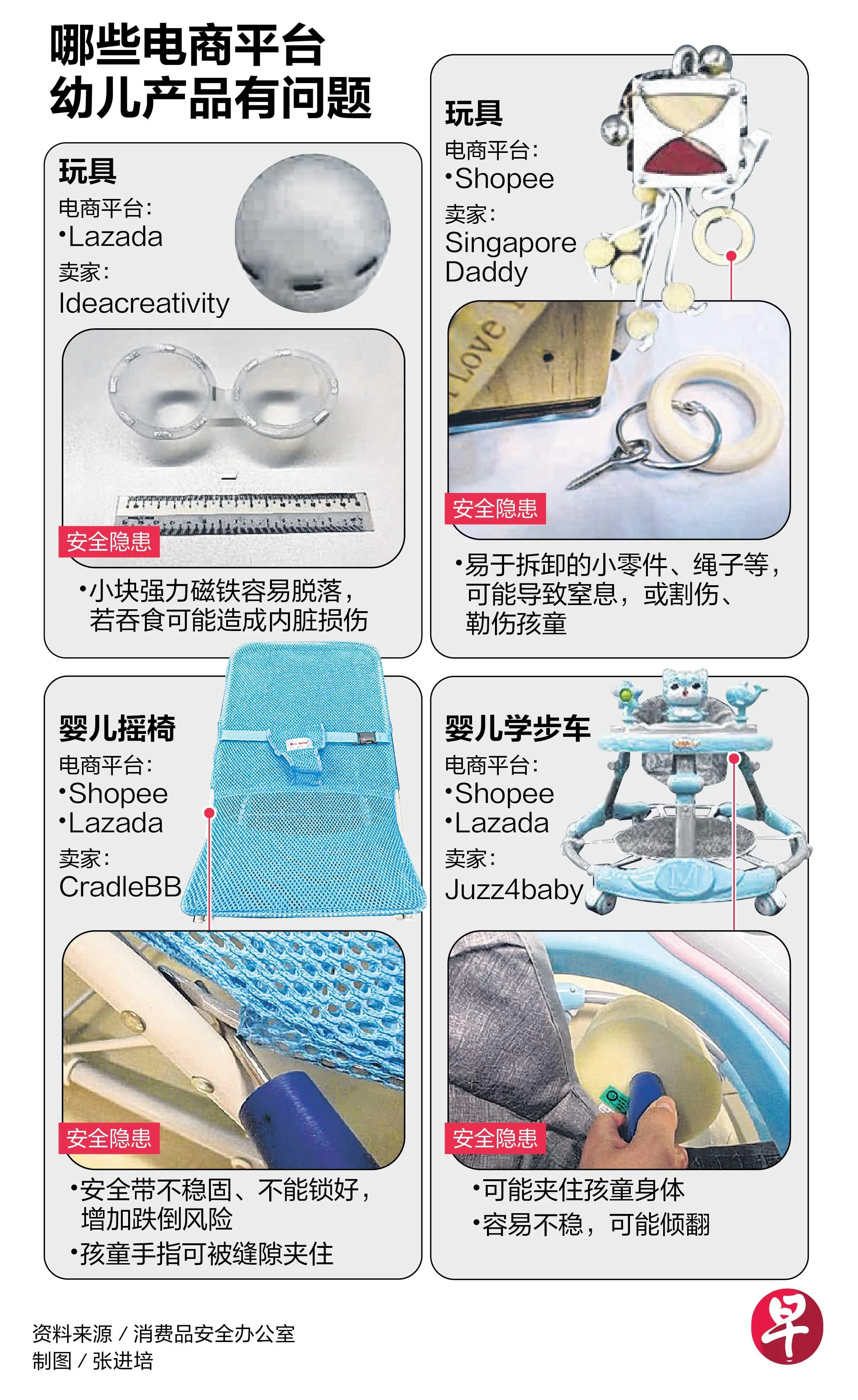 新加坡企业发展局与旗下的消费品安全办公室星期四(9月26日)发文告说,这些产品源于两大电商平台Shopee和Lazada,包括婴儿摇椅、婴儿学步车和玩具。