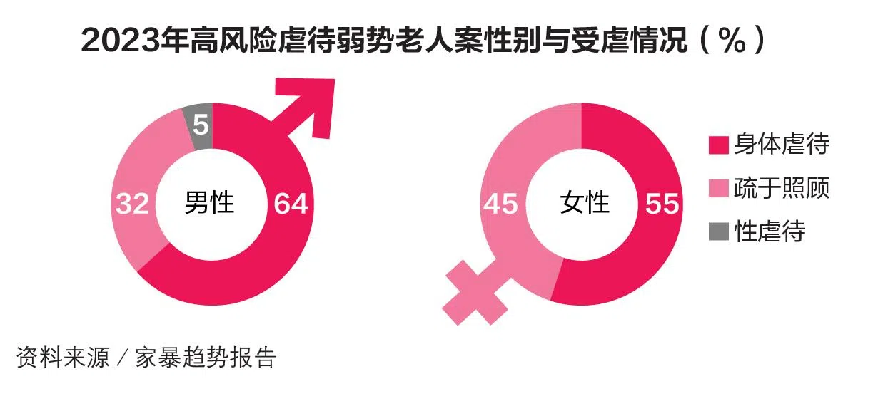 高风险弱势年长者的受虐案例,则呈下降趋势,从2021年的84起,减至2022年的50起,2023年进一步下降至42起。这类严重的虐待事件中,身体虐待是最常见的形式,男女皆是。