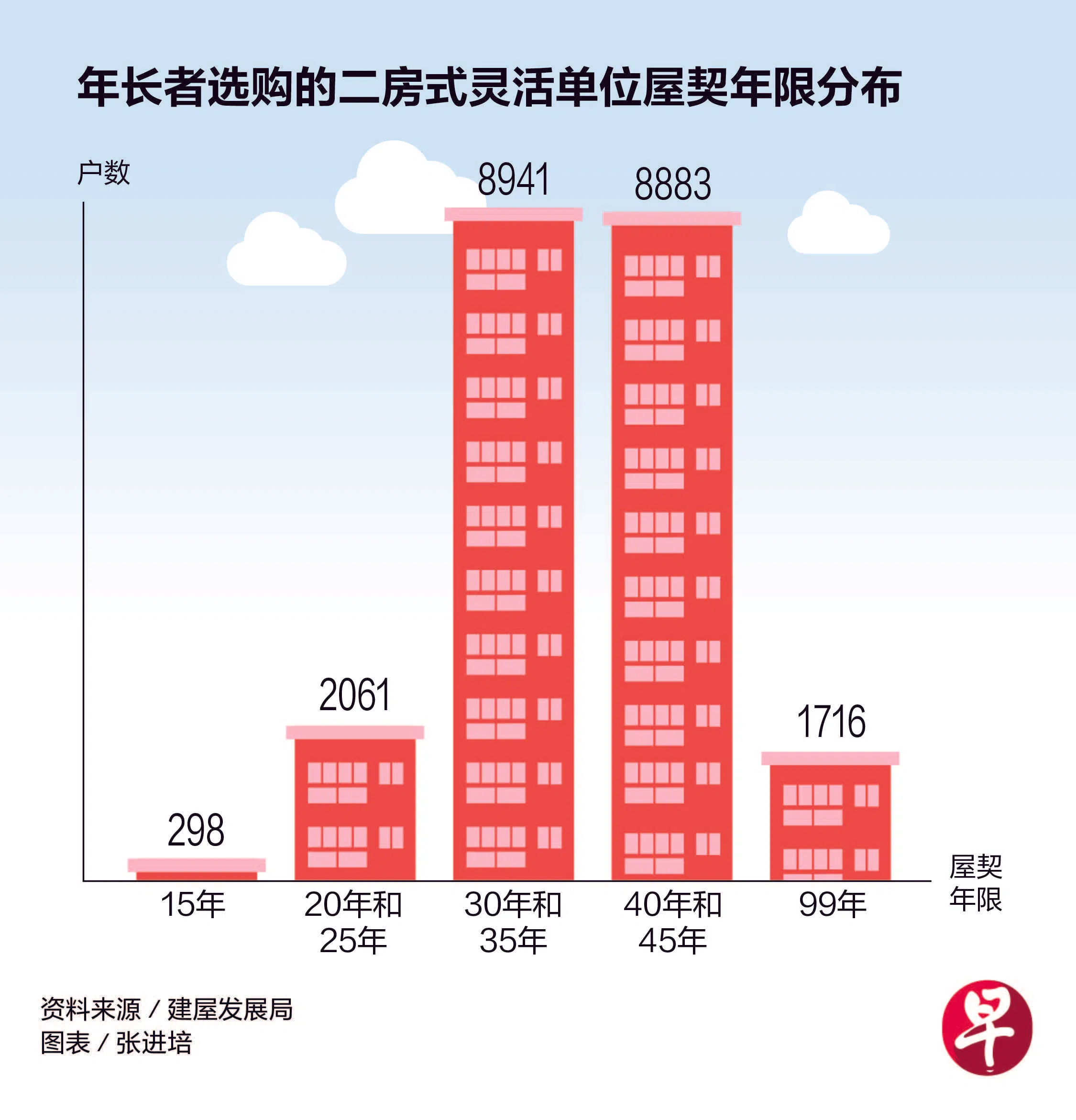 如今除了选择较短的二房式灵活单位屋契年限,年长组屋居民从实际角度出发,通过屋契回购计划,缩短屋契年限的例子也愈发常见。合登集团高级数据分析总监李思德向《联合早报》分析,申购二房式灵活单位和参加屋契回购计划的区别,在于年长者是否希望在原住处养老。“一些申请二房式灵活单位的年长者,可能是与子女一起通过多代同堂优先计划(MGPS)申请的——这可能是为何有较高比例的年长者选择40年或45年屋契的原因之一。”
