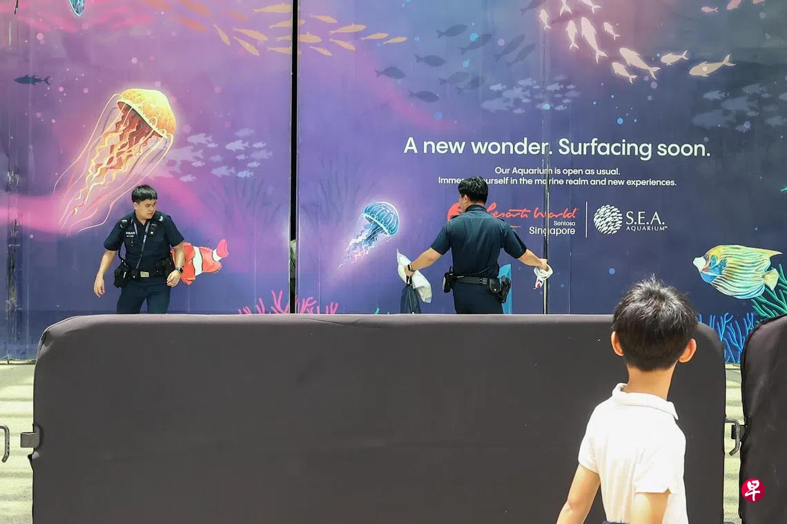 记者在早上10时30分抵达现场时,看到S.E.A.海洋馆入口旁的工地入口外有多名工作人员驻守,警察和民防人员多次进出工地。