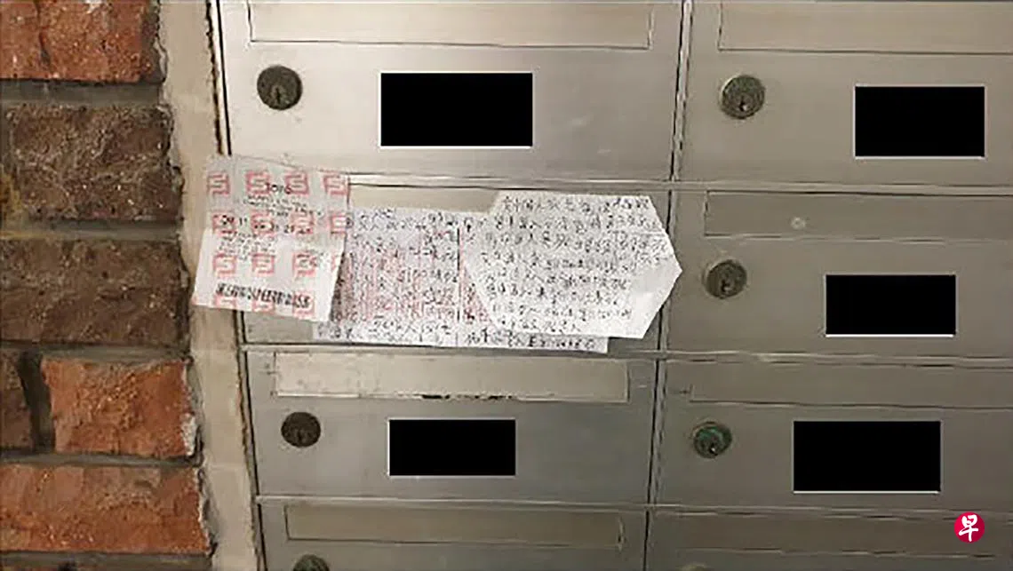 监控摄像头拍下的画面也显示,被告在2023年4月3日确实走到信箱前,并在信箱上贴了东西。警方随后将被告的字条取走调查。根据法庭文件附上的照片,被告在字条中写下“女中国人来新加坡死”等咒骂字句。