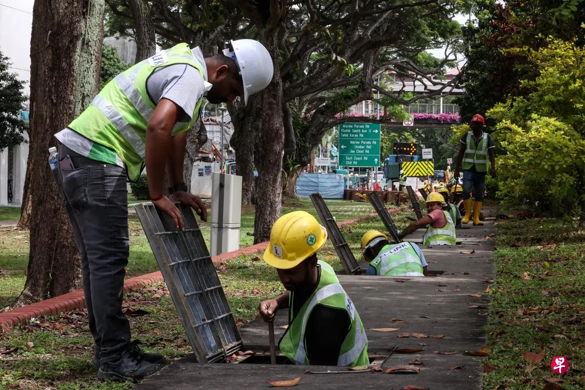 《联合早报》记者星期六(5日)早上重返现场,泥水退去后,承包商工作人员使用铁铲疏通排水沟的淤泥,行人天桥则暂时关闭,相信正在进行更换水管工作,其中一条车道也停用。草地泥泞不堪,还有些许积水。
