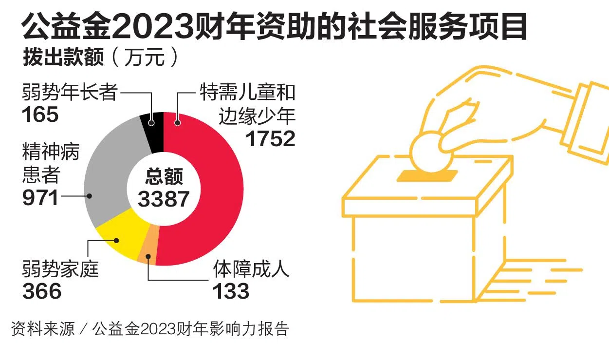 公益金去年财年拨出超过6900万元,支持288个项目。其中,约3400万元用来资助各项社服项目,让超过8万2000人受益,包括特需儿童和边缘少年、体障者、精神疾病患者,及弱势家庭和年长者。