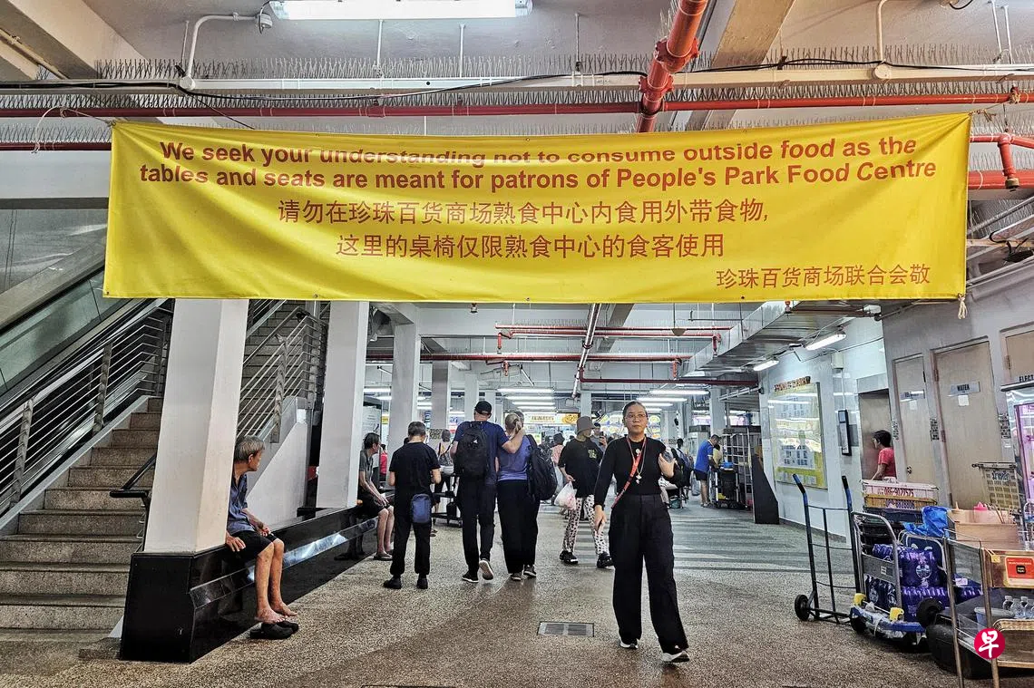 珍珠百货商场熟食中心面对外来食客“入侵”,导致一些客人找不到位子,令小贩的生意下降约10%,清洁工工作量也大增。商场近期悬挂布条禁止外带食物。