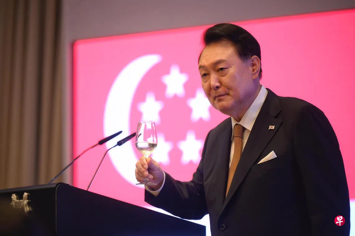 尹锡悦在致祝酒辞时说:“作为创建亚细安的其中一个国家,新加坡一直努力引领区域一体化,并从一开始就意识到团结与合作的价值。韩国将在同新加坡合作的基础上,在本周举行的韩国亚细安峰会,与亚细安建立全面战略伙伴关系。”