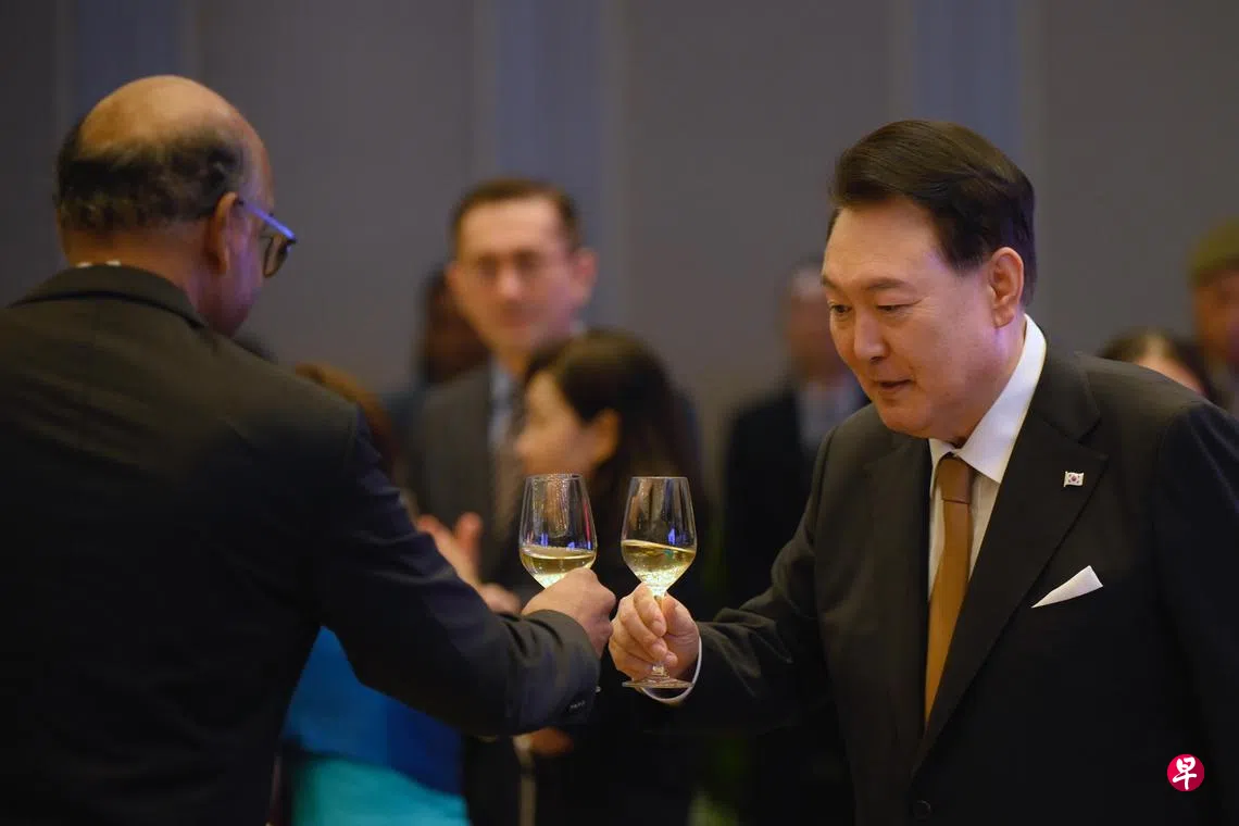 尹锡悦在致辞中也提及新韩之间日益频繁的民间往来。他说,“今天有许多新加坡年轻人喜欢韩国音乐和电视节目,韩国人也喜欢新加坡的咖啡、茶和咖椰(Kaya)酱。”
