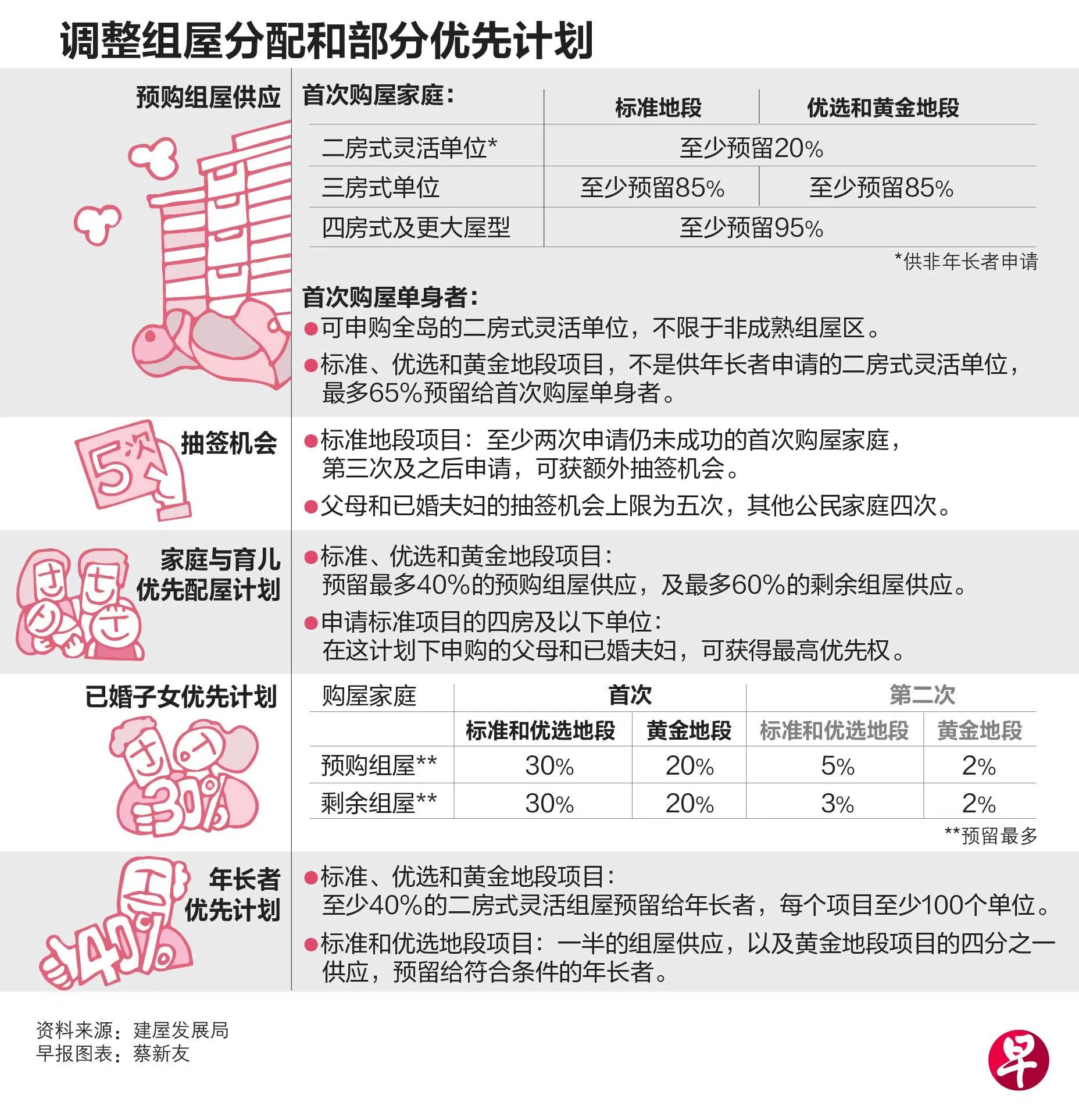 其中,当局为首次购屋家庭,在所有标准、优选和黄金地段项目中,预留至少20%非供年长者申购的二房式灵活单位,以及至少95%的四房式及更大屋型单位。三房式单位方面,标准地段项目中将为首购家庭预留至少85%,优选和黄金地段项目则预留至少95%。