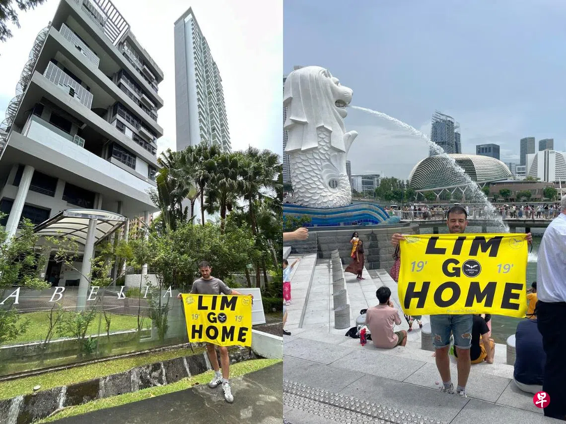 综合外媒报道,这对夫妻是西甲球队巴伦西亚(Valencia)的球迷。丈夫达尼·奎斯塔(Dani Cuesta)上星期四(10月3日)在社媒平台X上数次发文,内容包括他到鱼尾狮公园举旗帜抗议,以及到林荣福名下一处产业外举旗帜,以及在门口贴上贴纸。旗帜和贴纸上都写着“Lim Go Home”(意思是要林荣福“走”)的字眼。