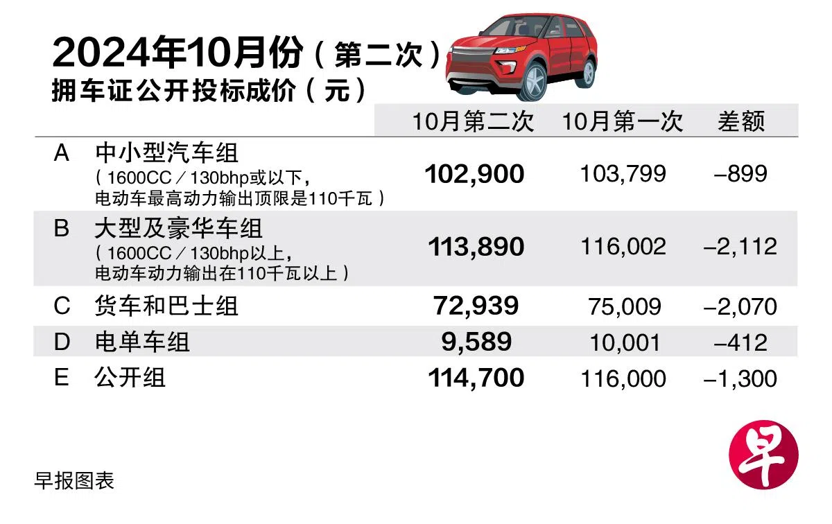 10月第二轮拥车证公开投标活动星期三(10月23日)结束,应对大众市场需求的中小型汽车组(A组)成价跌899元(0.8%),报10万2900元。
