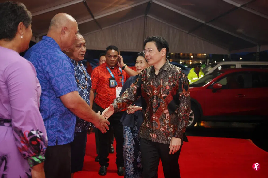 到访萨摩亚首都阿皮亚的黄循财总理和夫人吕子蕊,出席了在阿皮亚公园的招待会和国宴。黄总理在宴会上与萨摩亚总理马塔阿法交谈,并同其他领导人一起享用当地美食和观赏文化表演。