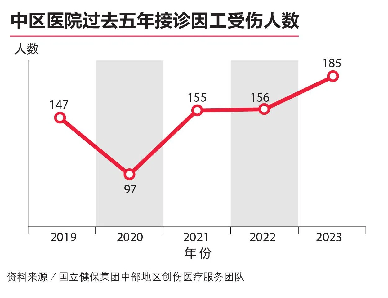 数据显示,除了冠病疫情首年的2020年,过去五年因工受伤送到中区医院如陈笃生医院、盛港综合医院、邱德拔医院的人数,逐年微幅上升。陈笃生医院是中部地区的创伤治疗主要医院,去年185名工伤意外伤者中,有123人送往这家医院。