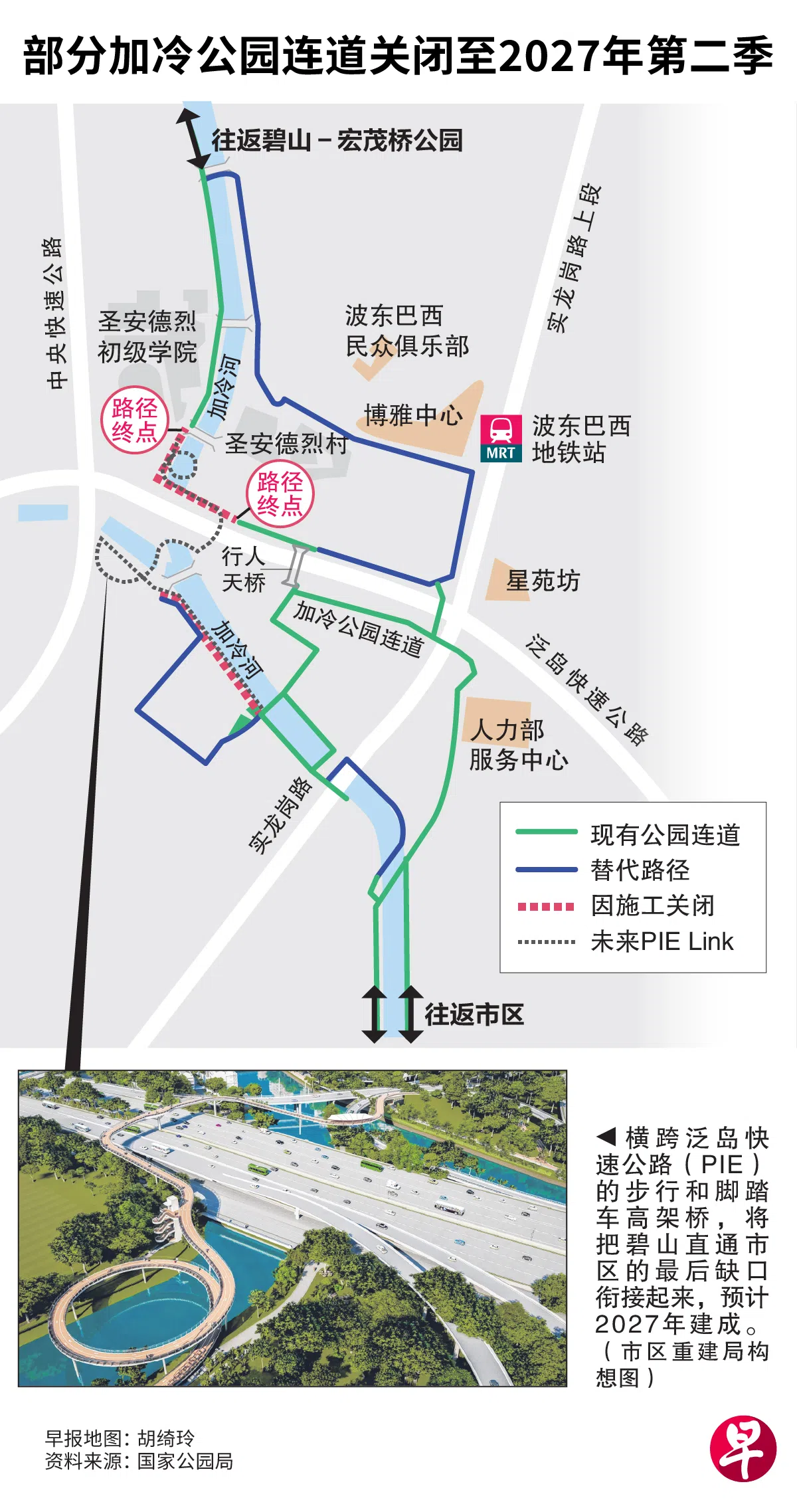 为建设横跨泛岛快速公路的步行和脚踏车高架桥,部分加冷公园连道将关闭至2027年第二季,期间从碧山前往市区的脚踏车骑士须改道而行。多数受访骑士认为,替代路径虽比原本途径稍长,但新路线路途较平坦,对骑行时间影响不大。