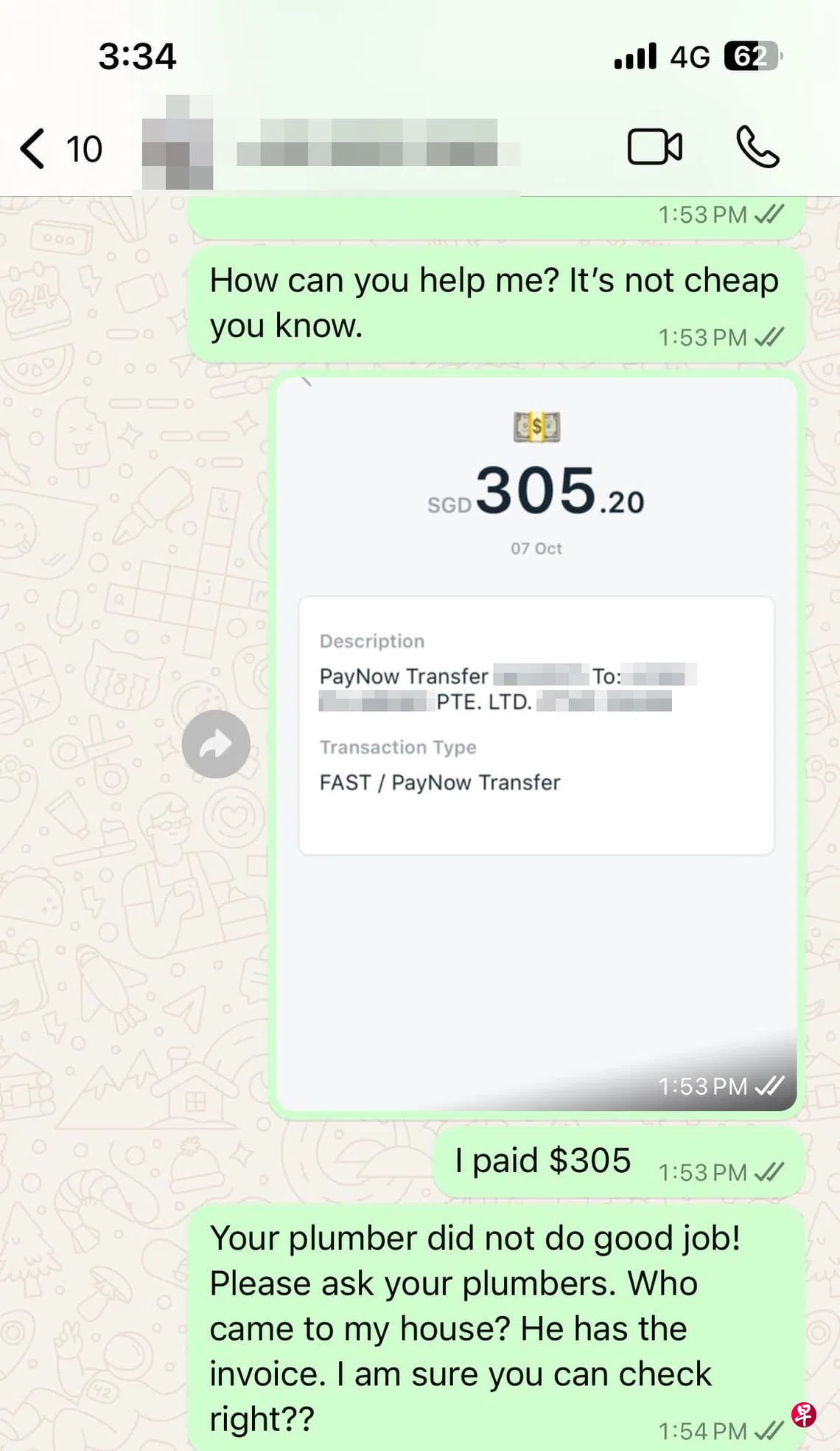 女子申诉,花逾300元维修水龙头,结果一周后又再漏水,找上维修公司时对方却以没有收据为由推脱,甚至拉黑她。