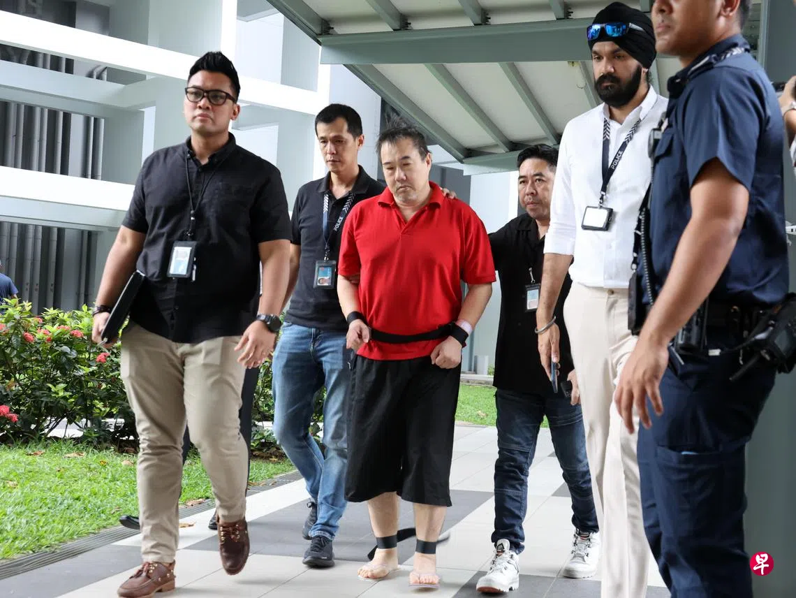 星期一早上10时20分左右,被控谋杀的嫌犯被带回案发现场协助警方重组案情和厘清细节。他头发凌乱、手脚上拷,身着红衣短裤和一双透明人字拖鞋。在第311B座组屋的下车点下车后,他全程低着头沉默不语,嘴角微微向下,神情呆滞。
