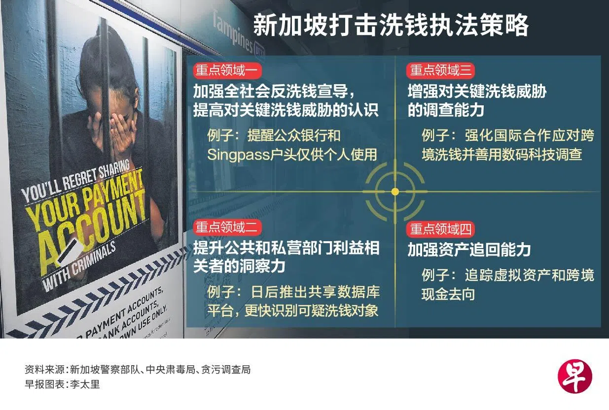 另一个重点领域是加强全社会反洗钱宣导,提高对最新洗钱趋势和风险的认识。例如,当局持续加强公众教育,强调交出银行和Singpass户头可面对的刑罚,也通过研讨会向利益相关者讲解当下的犯罪趋势,用以规避漏洞。
