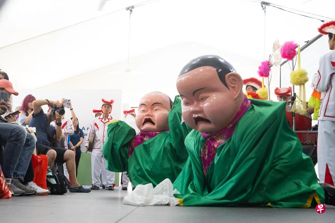 将牛车水广场布置成丧礼场地,“哭童”大头娃娃夸张地跪拜哭泣,现场气氛顿时凝重。