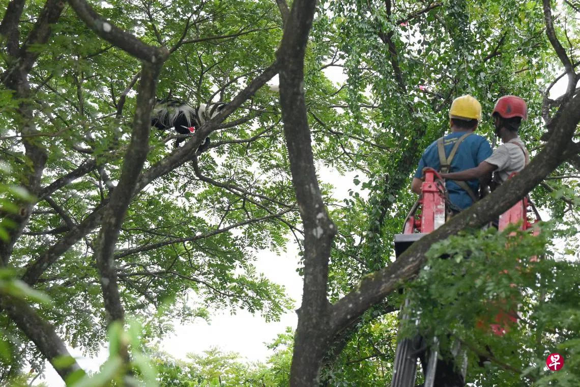 包括集团动物护理和兽医团队以及公园局在内的多支团队,星期四到蔡厝港附近的丰涛别墅公园(Villa Verde Park)追捕这只东黑白疣猴(eastern black-and-white colobus monkey),行动直到日落才结束。