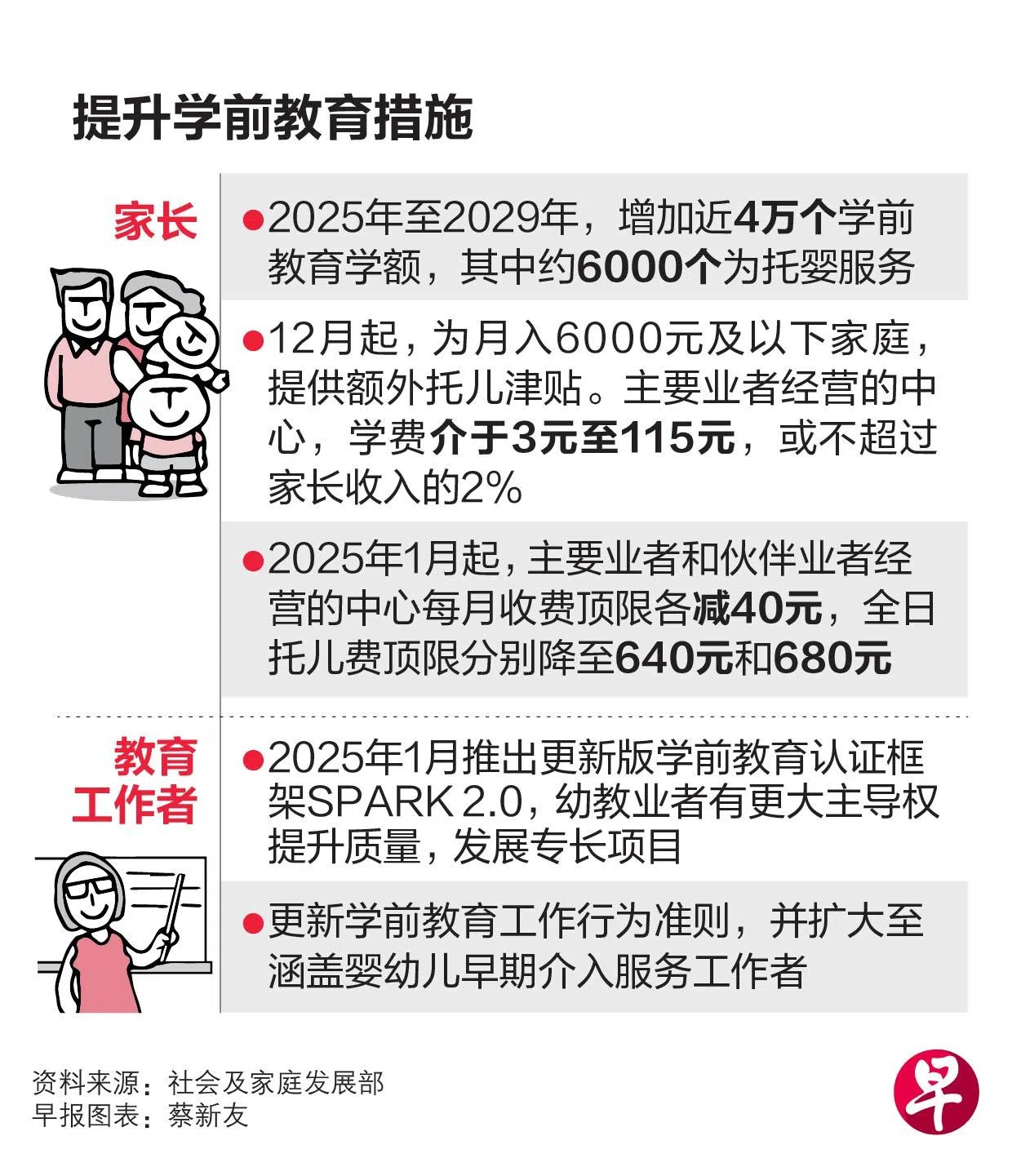 近年来,政府投入资源提供更多托儿服务,并确保收费合理。当局早前宣布,从明年1月起,主要业者和伙伴业者经营的中心每月收费顶限各减40元,全日托儿服务的收费顶限分别降至640元和680元。