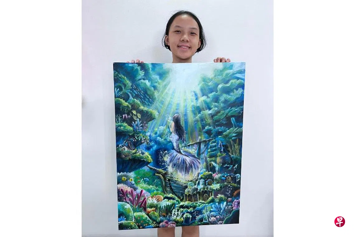 15岁的刘可萱喜欢童话的题材,从她的画作中可以看出公主和城堡等梦幻的元素。她告诉《联合早报》:“画画能让我抒发自己的情感。”