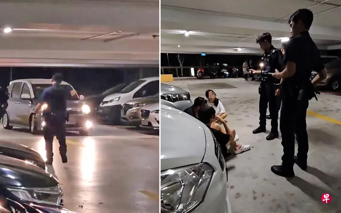 只见车子缓缓开上二楼,对方疑似看见警员,一度在斜坡上迟疑,接着把车往前开。此时,两名警员立即上前拦截,吆喝他们停车和下车。