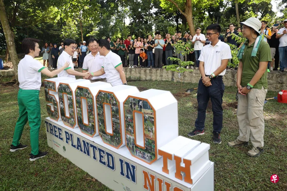 王瑞杰等嘉宾随后也在新加坡国立大学的大学城,与160名学生和教职员工参加了国大植树仪式,纪念在校园种植的第5万棵树。国大设定目标在2030年前栽种10万棵树,如今已达到一半,树冠面积从36%增加到60%,超过一半的校园已被树木覆盖。