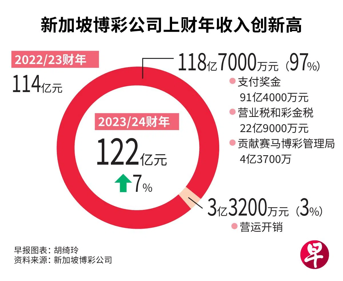 总收入中的91亿4000万元用于支付奖金,22亿9000万元支付营业税和彩金税,4亿3700万交给赛马博彩局。这三类款项占了博彩公司收入的97%或118亿7000万元,营运开销只占3%或3亿3200万元。新加坡博彩公司是世界上营运开销最低的博彩业者之一。