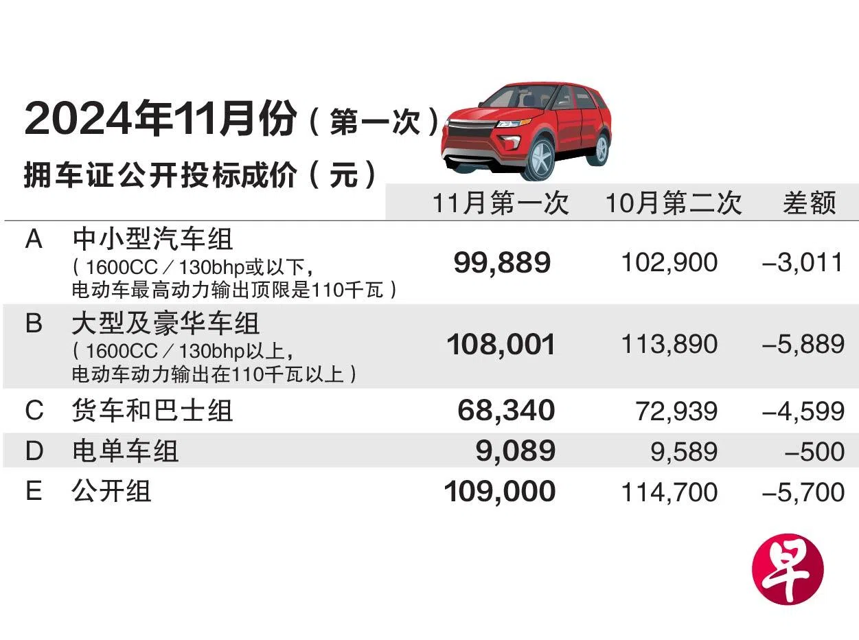 11月首轮拥车证公开投标活动于星期三(11月6日)下午结束,所有组别的成价连续两轮下跌,且跌幅都大于上一轮。