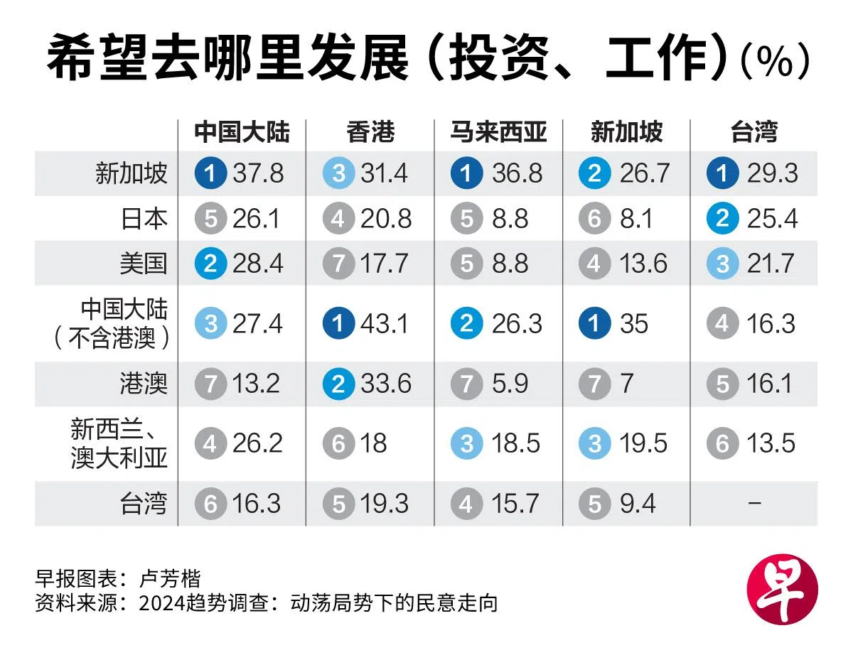 调查显示,中国大陆、马国,以及台湾受访者,最希望来新加坡发展。梁振雄指出,我国既是主权国家,也是国际都会,在国际间占独特定位,也提供区域发展契机。面对中美博弈,我国不选边站,相信能让其他受访者认为到本地发展是稳当的选项。