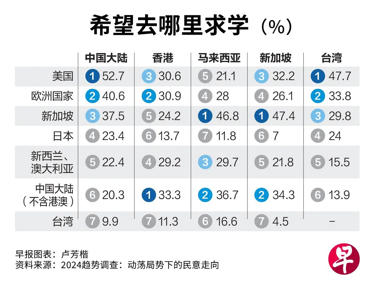 至于最向往到哪里求学,本地受访者前三首选为新加坡、中国和美国。