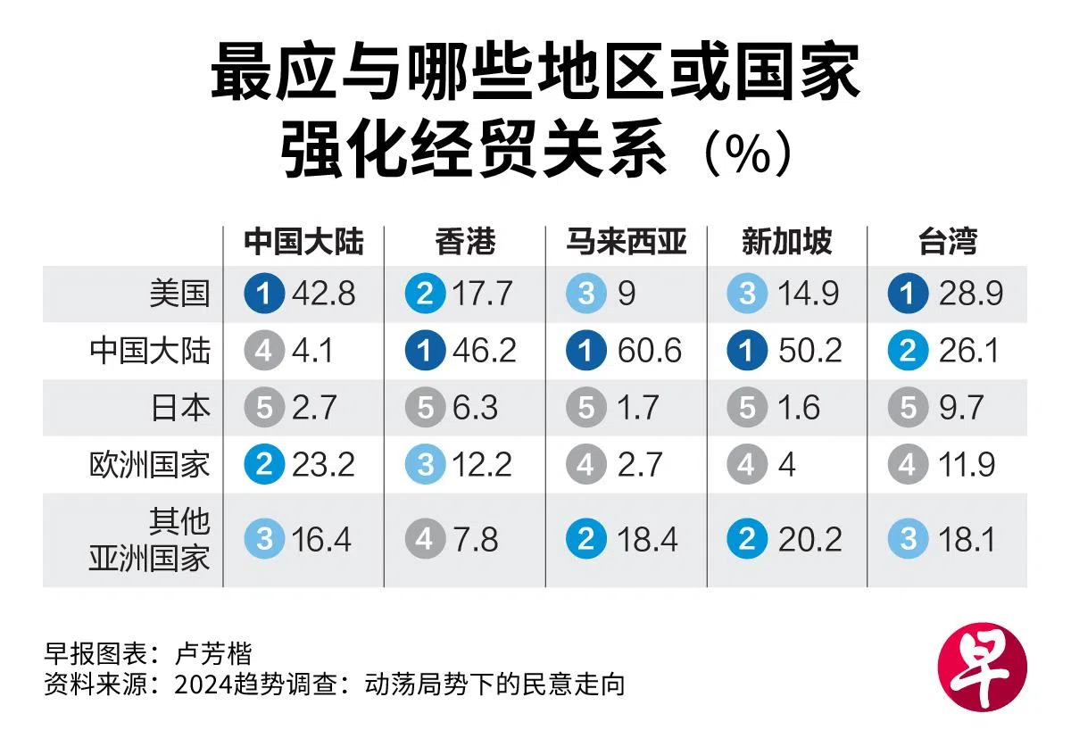 这项“2024年趋势调查:动荡局势下的民意走向”,由台湾《远见杂志》民意研究中心、新加坡《联合早报》、马来西亚《星洲日报》,以及香港浸会大学新闻与社会研究所合作进行,星期四(11月7日)公布结果。