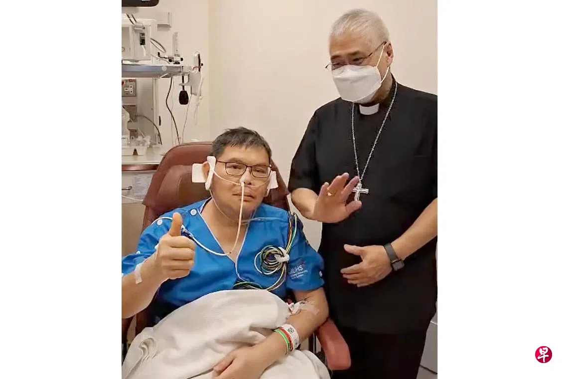 天主教新加坡教区总主教吴诚才枢机星期天下午透过脸书发布短视频,视频中李光兴身穿蓝色病服,身上插着管子,对着镜头挥手、竖起大拇指,向公众报平安。