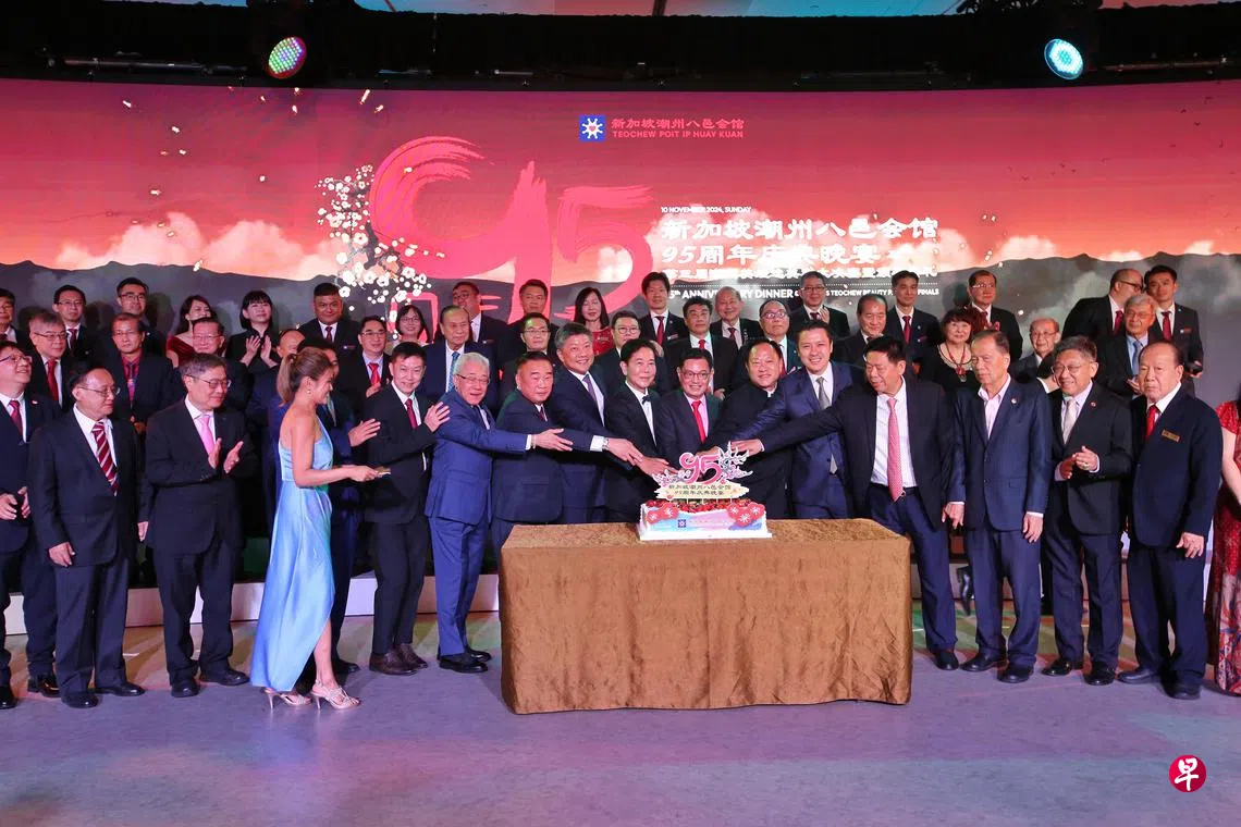八邑会馆昨晚(11月10日)于滨海湾金沙四楼宴会厅举行千人宴,宴开121桌,超过1200名海内外潮社人士、本地宗乡社团代表、各国驻新大使等参与其盛,主宾是副总理王瑞杰。据悉,晚宴出席者包括100多名来自中国各省市、马来西亚、澳门、香港、印度尼西亚、新西兰的潮社和国外潮州商业团体代表。