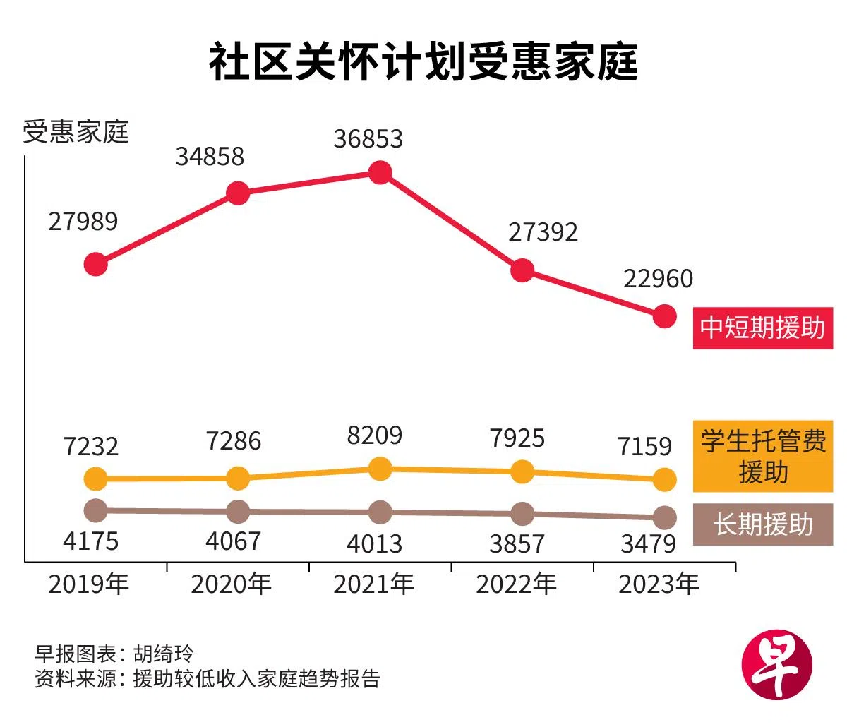 随着经济和就业市场在疫情后好转,以及政府的定心与援助配套和就业入息补助计划等援助举措,去年领取中短期援助的家庭有所减少,从2019年的2万7989户,减少至2023年的2万2960户。