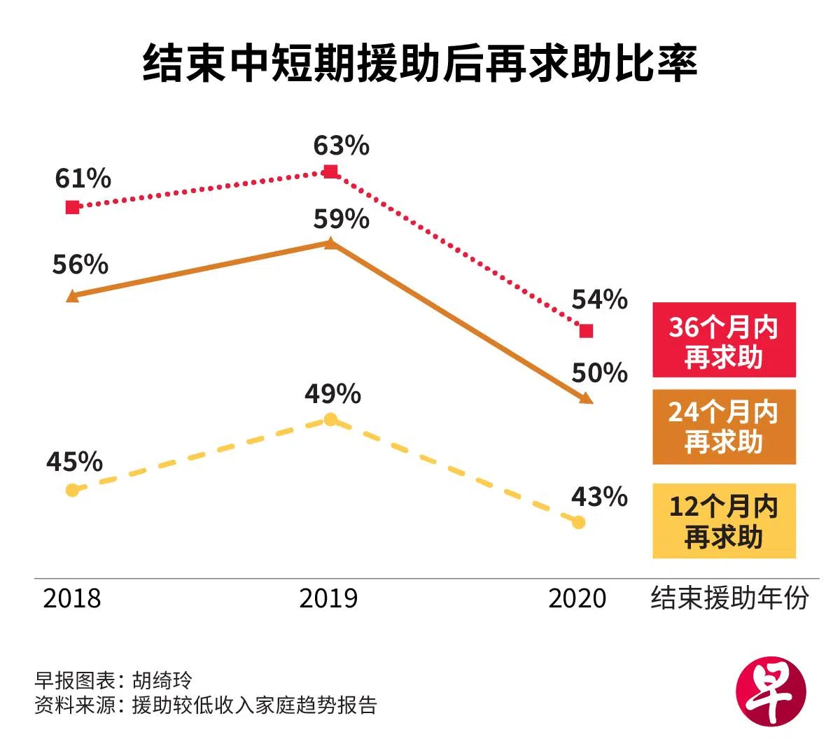 根据社会及家庭发展部星期二(11月19日)发布的援助较低收入家庭趋势报告,2020年停止领取中短期援助金的家庭,有54%在36个月内再次求助,比起2019年的63%有所下降,也比2018年的61%来得低。