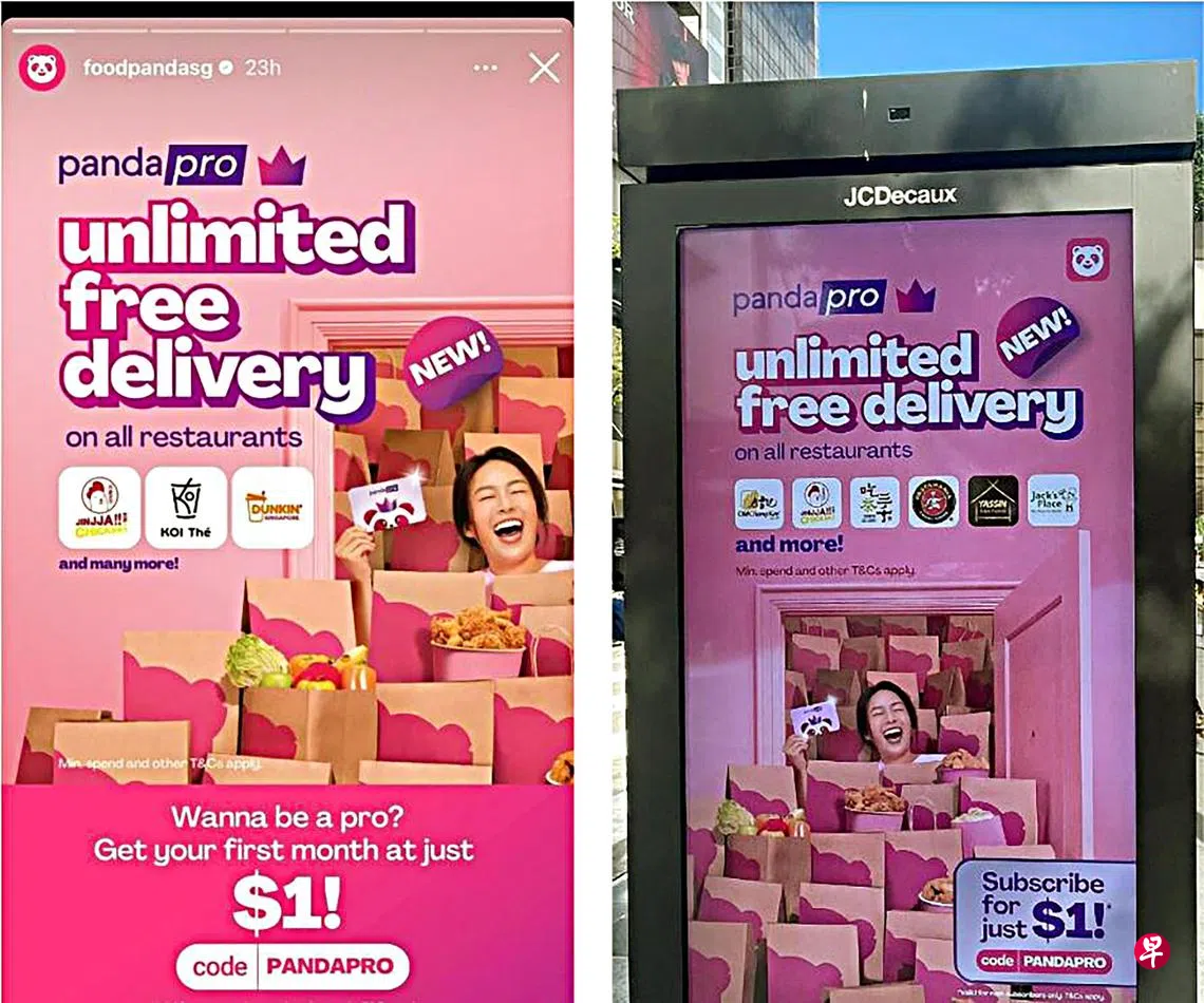 今年7月1日至9月30日的订阅服务期间,Pandapro打出“所有餐厅无限免费送餐”的广告语,并在多个平台上,包括Foodpanda的Instagram页面和应用内,以及巴士站等公共区域的广告牌上展示。