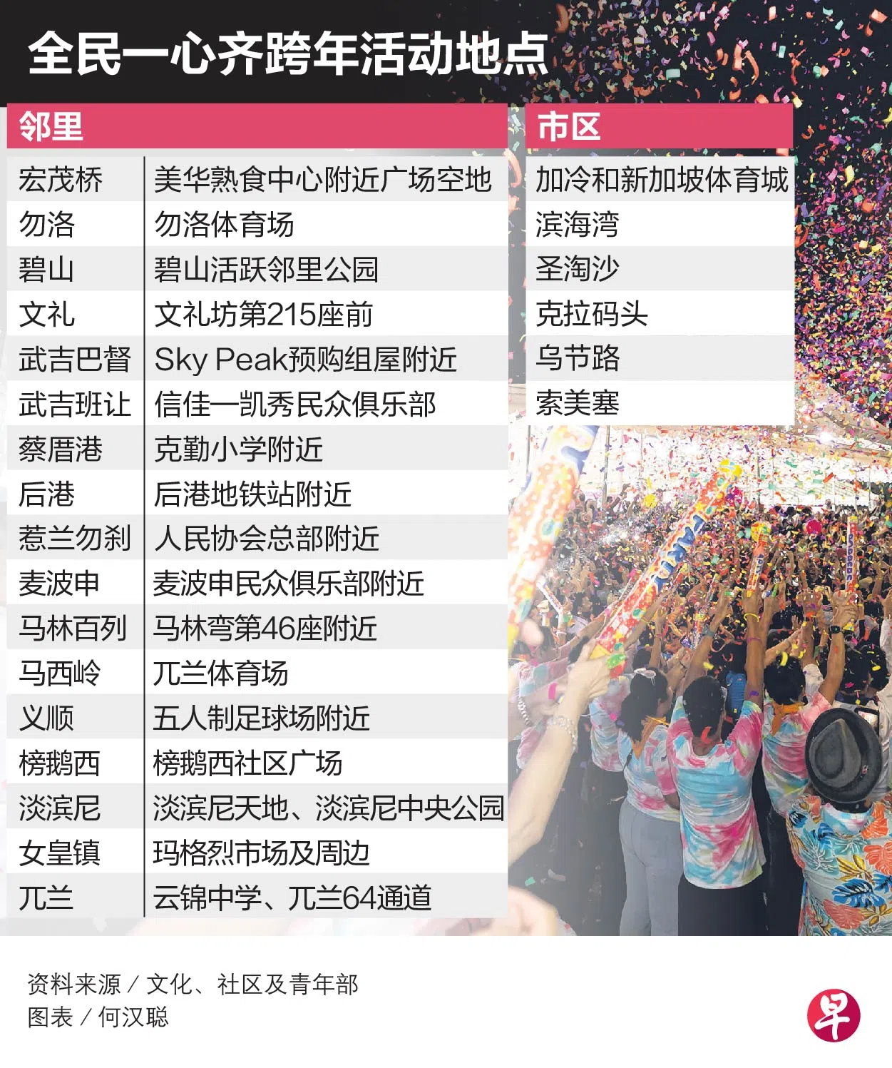 文化、社区及青年部星期四(11月21日)发文告,宣布“全民一心齐跨年” (ONE Countdown)的活动详情。除了滨海湾、新加坡体育城、圣淘沙、乌节路和克拉码头,全岛17个邻里也将在12月31日晚上举办庆祝活动,让民众在住家附近就能与家人朋友同欢。