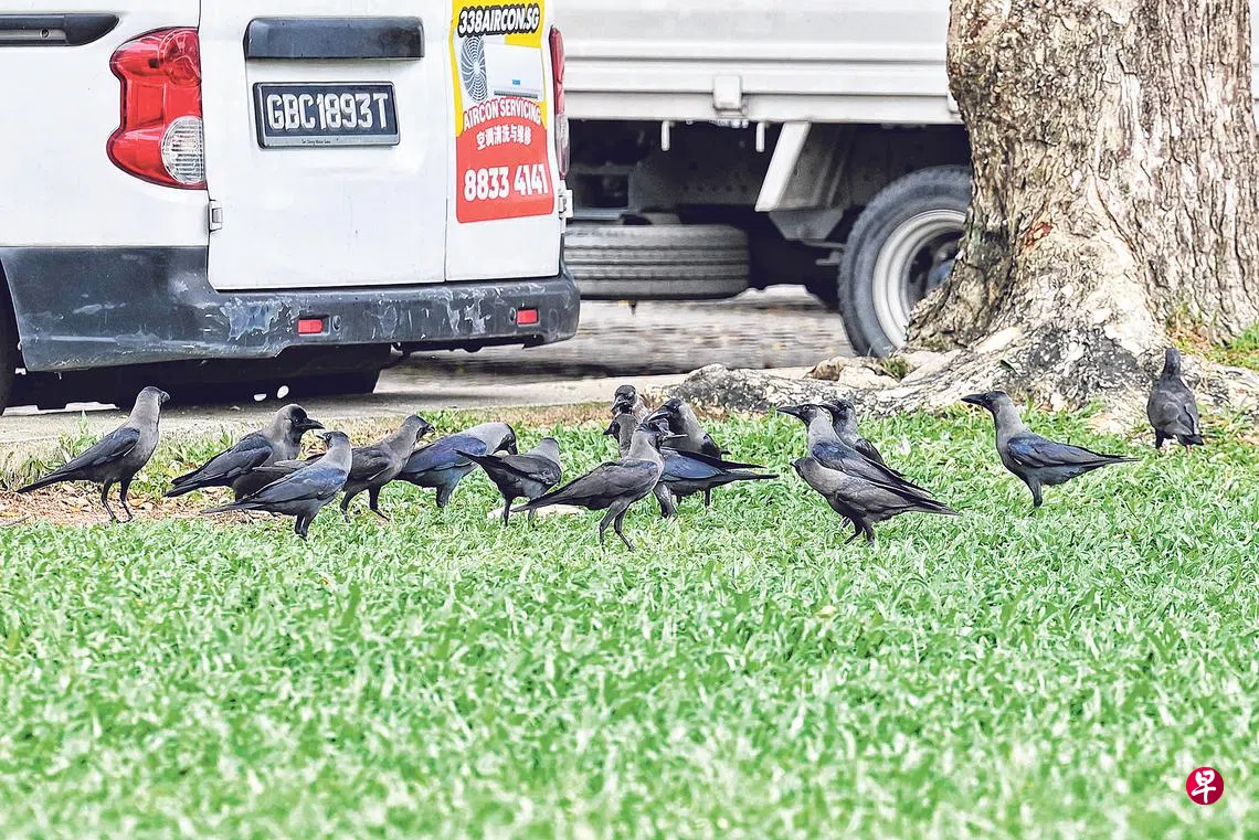 餐厅员工申诉,阿裕尼地铁站附近树上出现大批乌鸦,食材清晨送抵后,即使用篮筐盖起来,还是会被弄翻叼走。